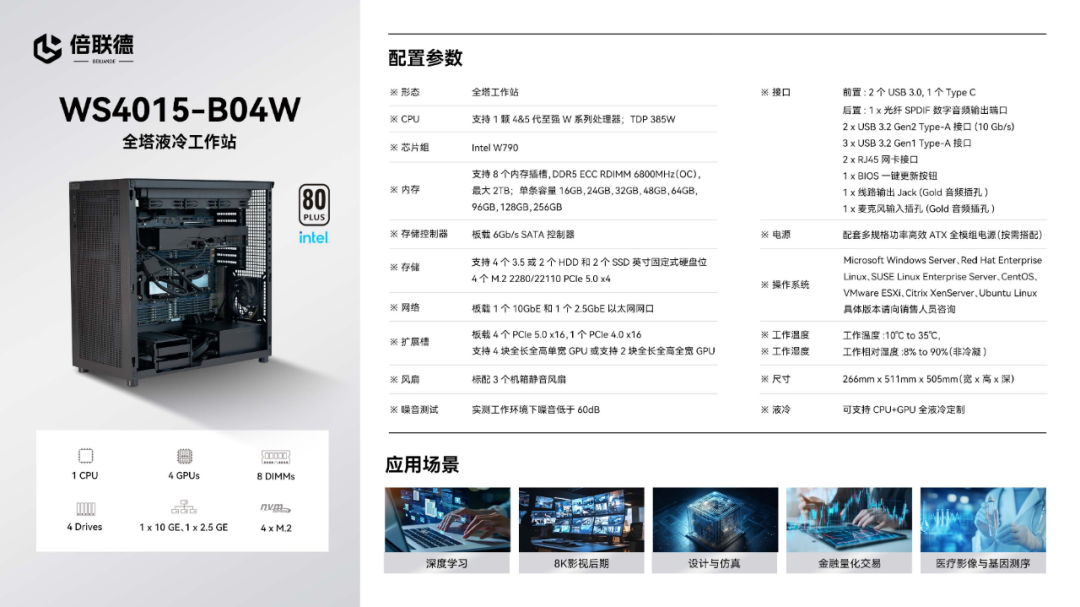 深耕服务器、高性能计算、液冷工作站领域多年,倍联德早已形成从 “整机结构设计、自主板卡开发到 BMC/BIOS 深度定制” 的完整技术链条。作为国家高新技术企业,我们始终以 “自主研发 + 定制化服务” 为核心,精准匹配医疗影像分析、工业设计仿真、金融量化交易等多行业的差异化需求,践行 “算力筑基,共赢未来” 的理念 —— 此次与 Intel 至强 W®系列的合作,正是倍联德 “链接顶尖资源,赋能产业升级” 的又一实践,旨在通过技术协同,让算力更贴合 AI 时代的实战需求。