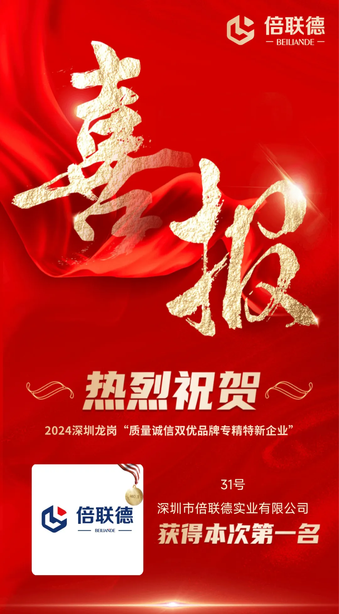【喜报】热烈祝贺倍联德荣膺2024深圳龙岗“质量诚信双优品牌专精特新企业”